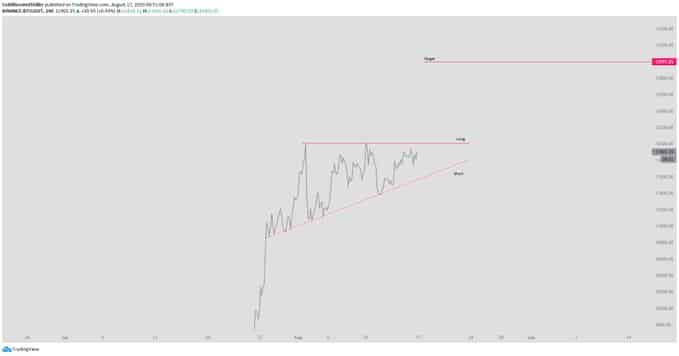Talking about the way Bitcoin has formed an ascending triangle marked by higher lows and equal highs, the trader wrote in regards to the chart depicting the pattern: “As easy as it gets. The simple $BTC plays.”
