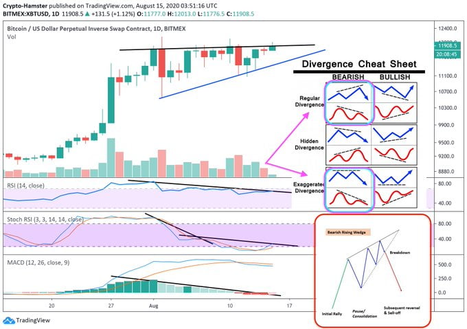 The trader in question noted that Bitcoin might be in a risky zone because the rising wedge is taking shape, as well as some bearish divergences.