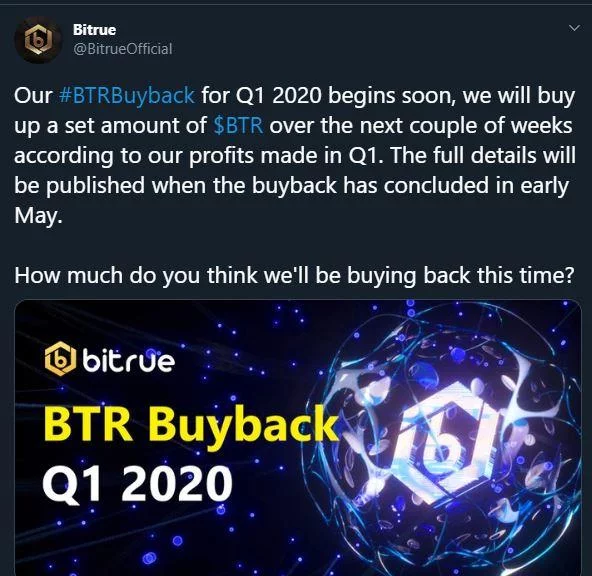- Every quarter of the year since late 2019, the team at Bitrue has set aside 20% of their profits to buy back Bitrue Coin (BTR).