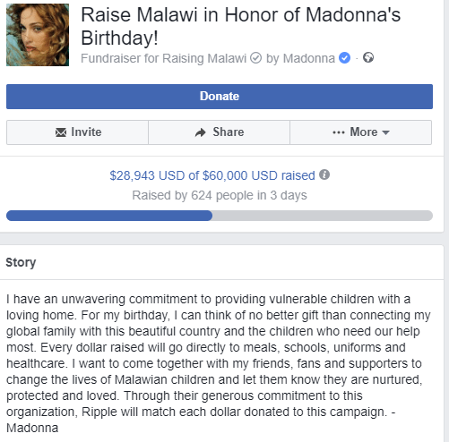Ripple said that they plan to make XRP donations. Madonna posted on her Facebook profile that “Every dollar raised will go directly to meals, schools, uniforms, and healthcare. I want to come together with my friends, fans, and supporters to change the lives of Malawian children and let them know they are nurtured, protected and loved. Through their generous commitment to this organization, Ripple will match each dollar donated to this campaign.”