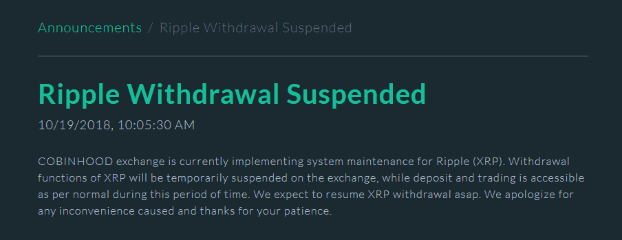 At 10:5:30 AM, COBINHOOD announced that Ripple Withdrawal is Suspended in order to implement system maintenance for XRP. You can see their announcement below.